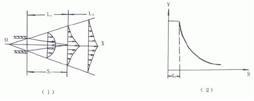 压缩空气从圆形喷嘴喷射的射流称为自由圆射流,从平直狭缝喷射的射流称为自由平面射流。自由圆射流结构与速度如图2-12所示。