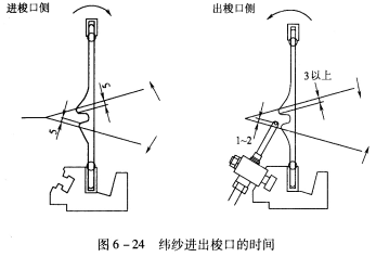 在实际运转的织机上,经纱存在着动态张力,且纱线表面的毛羽会造成粘连现象,使开口过程中经纱离开筘槽的实际时间延迟。因此,按上述方法确定纬纱最早进梭口时间时,上、下层经纱应分别离开筘槽的