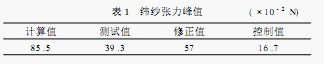 在计算纬纱的张力峰值之前首先测量纬纱的弹性模量它是在纱线强力仪上通过测试纬纱伸长与所受张力的关系经换算而得其它参数可由喷气织机的实际运转情况得到由式(12)计算的结果如表1,织机在同样的运转条件下使用,相同的纬纱测试纬纱的张力峰值结果如表所示。