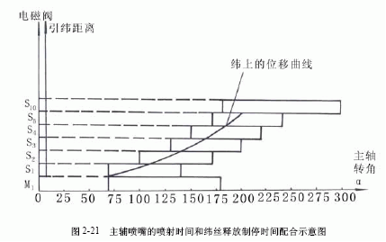 储气筒2稳定供气压力,在规定的时间提供给主喷嘴、辅助喷嘴、吸纬喷嘴等需要压缩空气工作的装置。喷气引纬的供气系统如图2-20所示。