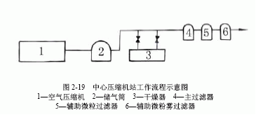 制备上述高质量的压缩空气使用中心压缩机站,中心压缩机站工作流程示意图如图2-19所示。空气压缩机1将空气加压到喷气引纬要求的压力,压入储气筒2,空气在压缩过程中被加热,大量的水分凝结为冷