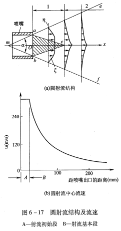 在射流的边界,气流除了存在沿轴线方向的运动外,还存在垂直于射流轴向的运动,由于喷出的气流与周围静止的空气之间存在速度梯度(速度差),所以靠近边界的射流脉动微团,要与周围的静止空气发生掺混,结果是射流将自己的一部分动能传递给周围空气,射流的流速因此而衰减,此为射流的扩散作用。同时,一部分原来静止的空气被射流带着向前运动,即为射流的卷吸作用。在射流初始段,射流流速很高,负静压显著,于是周围的空气在静压差作用下不断流向射流,产生了明显的射流卷吸作用。随着射流流速的不断衰减,这种卷吸作用将逐渐削弱。由于扩散和卷吸的共同作用使射流截面不断扩大,流速迅速下降。射流中心的流速ν呈衰减曲线,如图6—17(b)所示,其中ν0为喷嘴出口处中心点的流速。