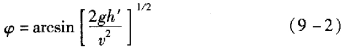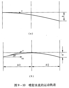 在织制窄幅织物时,喷嘴可沿与钢筘平行的方向喷射;织制宽幅和加捻丝织物时,可将喷嘴的喷射方向调整到使纬丝飞行到右侧探纬器前面20mm左右。在考虑喷射的上下方向时,必须考虑水射流因重力引起的落差。图9-10(a)为水平喷射,出梭口侧因水流重力引起的落差为h。图9—10(b)为上仰喷射,以仰角φ喷射的射流最高点在上机筘幅中点处,水射流的落差为h′。如果其他条件不变,喷嘴水平喷射与上仰喷射的落差存在关系: