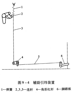 在织机的墙板外侧还装有一套辅助引纬装置,如图9—4所示。脚踏板6被踩下时,通过连杆5和角形杠杆4,带动连杆3向下运动,借助于另一连杆2上的转子压下辅助杆(图9—3),使活塞向左移动,泵体吸水。当脚踏板被迅速释放后,水流就会从喷嘴喷出。在正常开车前连踩几次脚踏板,可以排除里面的空气;在处理完纬纱故障后踩一次脚踏板,可补入一根纬纱。