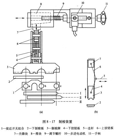 (3)当片梭被制停在位置Ⅲ,接近开关c不发出信号,说明制梭力偏大,计算机自动记录制梭力偏大的次数,如果27次引纬中有20次制梭力偏大,则每27次引纬后步进电动机反向转动一步,使制梭脚上升一定距离,经几次调整直至片梭被制停到位置Ⅱ,然后,再自动调整到位置I。这样的调整方式有助于消除机构间隙对制梭的影响。