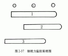 如图2-35所示,制梭力由制梭脚的高低位置控制,即制梭通道间隙越小,制梭力越大。在片梭引纬中实现自动调整制梭力,在制梭脚前侧安装有接近开关a、b、c,如图2-37制梭力监控原理图所示,接近开关b用于检测片梭飞行到达时间,如果在规定时间未能触发接近开关b,则片梭投梭力不足,进入制梭装置的时间太迟。接近开关a、c用于监测片梭的制停位置。在规定的时间,当片梭制停在位置1时,接近开关a、c均产生信号,说明制梭力正常,制梭马达6不发生作用;当片梭制停在位置2时,接近开关a没有产生信号,说明制梭力不足,制梭马达6立即发生作用,使制梭脚1下降一级;当片梭制停在位置3时,接近开关c没有产生信号,说明制梭力太大,如果连续27次引纬中有20次制梭力偏大,制梭马达6发生作用,使制梭脚1抬高一级,反复几次调整直至片梭制停在位置1上。