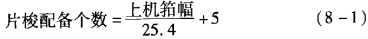片梭飞到对侧的接梭箱后,由位于经纱下方的输送链将片梭从接梭箱侧运回到投梭箱的升梭器内。输送链的链条节距是12.7mm(0.5英寸),每隔20节链条,装有一个推梭块,片梭在推梭块推动下返回投梭侧,相邻两个推梭块的间距为25.4cm,两个推梭块间有一个片梭。因此,每台织机所需的片梭个数与上机筘幅的大小有关,可按式(8—1)计算: