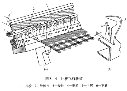 片梭在梭口中一般以30m/s左右的速度飞行,加之片梭质量轻、体积小,须采用由导梭片组成的通道来控制片梭的飞行。导梭片的形状如图8—4所示,它们等间隔固装在筘座上,随筘座一起摆动。因投梭机构与筘座是分离的,这就要求引纬时筘座静止在最后方,让片梭在导梭片组成的通道中飞越梭口。片梭到达接梭箱后,筘座向机前摆动打纬,导梭片逐渐从下层经纱退出,纬纱便从导梭片的脱纱槽中脱出留在梭口,被钢筘打入织口形成织物。打纬后随着钢筘向后摆动,导梭片又逐渐从下层经纱进入梭口,直至位于梭口中央并静止,供下一引纬的片梭飞行。