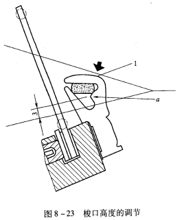 如图8—23所示,使织机停止在180°位置,即梭口处于满开状态,这时上层经纱应在导梭片顶部上方1mm左右,下层经纱在导梭片孔腔内凸缘a的下方3mm左右,这样可保证片梭在梭口内顺利飞行,不打断经纱。