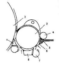 (2)刺辊车肚的气流与除杂 在刺辊3与给棉板5(给棉罗拉4)隔距点处,因隔距小而又有棉须,故可看作刺辊附面层的形成点,在第一落杂区内,附面层形成并逐渐增厚,要求自给棉板下补入气流,补入气流对刺辊上纤维有一定的托持作用,增厚的附面层在除尘刀7处受阻被分割,大部分气流被除尘刀阻挡而沿刀背向下流动,其中的杂质、短纤维随之落入车肚或被吸风口7吸走。进入刺辊与除尘刀隔距的气流通过分梳板8的导棉板6后又开始增厚,并要求从导棉板下补入气