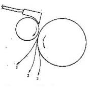 刺辊对棉层进行分梳时,纤维和杂质被锯齿带走并随其作回转运动,脱离锯齿的纤维与杂质便悬浮于刺辊的附面层中,杂质因体积小,重量大而多处于附面层的外层,纤维因其体积大、重量轻而多浮面层的内层,并沿着各自的运动轨迹离开附面层下落,如图3-2-9所示。利用纤维与杂质在附面层中的分类现象,对附面层进行不同的切割,即可达到去杂保纤,调节落棉的目的。在附面层中,纤维与杂质的运动了是互为影响的,有些纤维与杂质粘连较紧而随杂质一起落下成为落棉,也有一些与纤维粘滞力较强的细小杂质随纤维继续在附面层中前进。