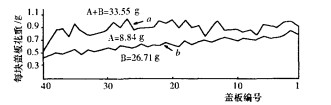 工作区内各根盖板的纤维量如图1中曲线a所示(采用锡林急刹车和6人在两侧同时迅速放大盖板隔距,在20~30S内完成),各根盖板的内层纤维如曲线b所示,a、b之间为各根盖板的自由纤维。