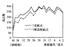 (3)根据工作区内各根盖板上杂质的分布(图2)可知,大部分杂质在头上几根盖板位置就被抛上盖板,在l5根左右以后,杂质几乎达到“动平衡”。(刺辊恻)盖板编号/道夫