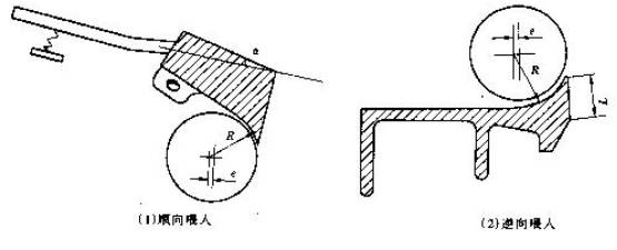 给棉罗拉为一表面刻有齿形沟槽或包有锯齿的圆柱形回转体,根据与给棉罗拉的相对位置,给棉板有两种形式,其剖面形状如图3-2-2所示,给棉板前沿斜面长度称为给棉板工作面长度。