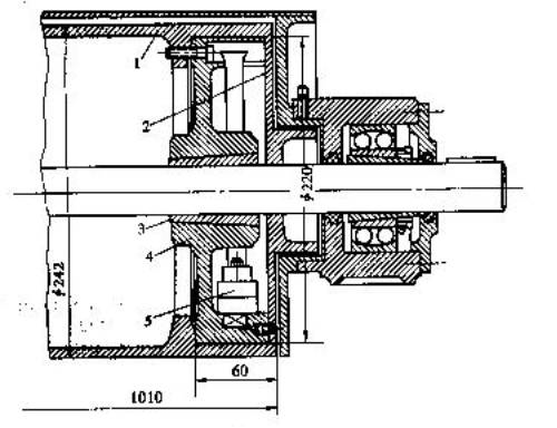 刺辊主要由筒体1和包覆物(锯条)组成,筒体有铸铁和钢板焊接结构两种,筒体外包覆有金属针布。筒体两端用堵头4(法兰盘)和锥套3固定在刺辊轴上,沿堵头内侧圆周有槽底大,槽口小的梯形沟槽,平衡铁螺丝可沿沟槽在整个圆周移动,校验平衡时,平衡铁5可固紧在需要的位置上。平衡后再装上镶盖2封闭筒体。