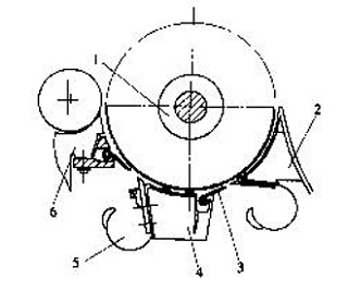 1-剌辊 2-三角小漏底 3-导棉板 4-分梳板 5-吸风口 6-给棉板