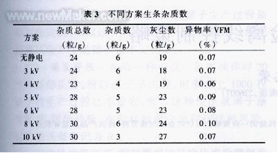 由表3数据可看出,静电特殊吸风装置对杂质的排除也是有影响的,其中在4kV时杂质数有一定的改善,杂质粒数下降33%,异物率下降14.3%,其它方案对杂质和灰尘影响不大,甚至有所下降。