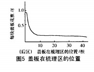 (1)盖板正转时新进人工作区的头上10根左右很快的被纤维充塞,中、前区盖板是在充塞情况下超负荷工作,其分梳、除杂作用较差(这也是目前正向回转盖板存在的主要问题),盖板反转后除后区头几根盖板花较多外,其余中前区盖板负荷均比正转时小,只有正转时的1/3~1/2左右(图5),这对分梳除杂是有利的。