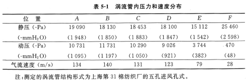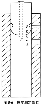 图5—6为涡流管内微型毕托管测定的部位。A、B、C、D、E、F六点均在纺纱位置附近并接近管壁处。测得数据及计算结果列于表5—1中。