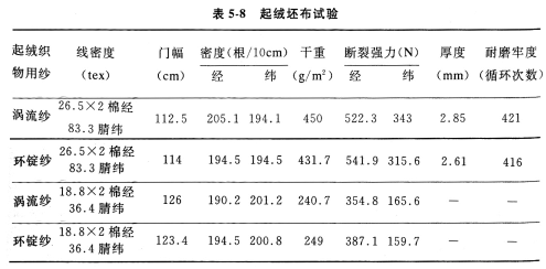 表中结果发现:涡流纱织物起绒后,强力只降低5%左右,而环锭纱织物起绒后,强力要降低40%左右。从表5—7可以看出,涡流纱的单纱强力只有环锭纱单纱强力的56.5%~62.2%,但织物起绒后,涡流纱织物的纬向强力是环锭纱织物的1.04~1.16倍,经向强力相差无几;厚度是环锭纱织物的1.09倍,耐磨牢度是环锭纱织物的1.095倍。又因涡流纱织物起绒后纤维被拉断,纤维的另一端紧紧钩在纱芯上,绒面上没有僵斑,绒毛平整、细密,起绒厚、丰满,耐磨牢度高,保暖性好,落毛率少。所有以上指标都优于环锭纱织物。