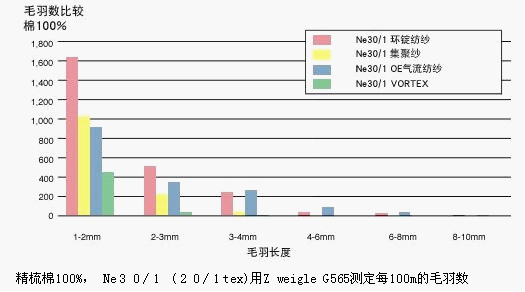 喷气涡流纺设备加工棉纤维时,对棉纤维特性有较高的要求,需要高等级的棉花,纤维长度要长,短纤维含量要少。棉纤维长度较短,短绒含量高时将导致纺纱生产中纤维散失明显,织物耐磨性差。