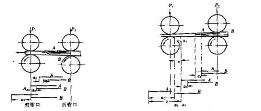 如图5-3-2 所示是两对罗拉组成的牵伸区。假设A、B是牵伸区内两根等长且平行伸直的纤维,牵伸之前A、B头端距离为a0,假设两根纤维都在同一变速点(前钳口线处)变速。变速之前两根纤维都以后罗拉表面速度v1前进,由于纤维A头端在前,到达变速点的时间较早,变速后以前罗拉速度v2前进。纤维A变速后,纤维B仍以较慢的速度v1前进直到前钳口线。