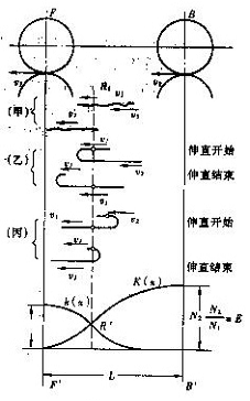 牵伸过程中纤维的伸直过程,就是纤维自身各部分间发生相对运动的过程。在须条中纤维的形态一般分为三类。即无弯钩的卷曲纤维,前弯钩纤维和后弯钩纤维。无弯钩的卷曲纤维,纤维的伸直过程较为简单,当它的前端与其他部分之间产生相对运动时,纤维即开始伸直。但是有弯钩的纤维,伸直过程较为复杂。通常将有弯钩纤维的较长部分称为“主体”,较短部分称为“弯钩”,位于牵伸前进方向的一端称为前端,另一端称为后端。弯钩与主体相连处称为弯曲点。弯钩的消除过程,即弯钩纤维的伸直过程,应看作是主体与弯钩产生相对运动的过程。主体和弯钩如果以相同速度运动,则不能将弯钩消除。