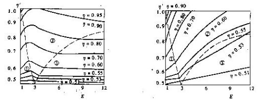 各种牵伸倍数下前弯钩纤维的伸直效果,可以用函数图像来表示,如图5-3-15所示。横坐标表示牵伸倍数,纵坐标表示伸直系数η/,各条曲线表示各种原始伸直系数的纤维在不同牵伸倍数下的伸直效果。图像共分为三个区。第①区表明牵伸倍数较小(E<3)时,伸直效果随牵伸倍数的增大而提高;第②区表示牵伸倍数增大(E>3)时,伸直效果先增后减,总的伸直效果不明显;第③区表示牵伸倍数更大(E>4~6)时,各线段趋于水平,即η/=η,无伸直效果。