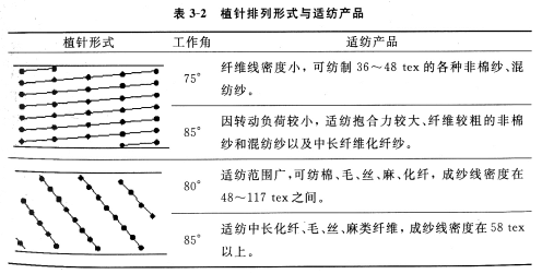 针辊的工艺参数包括植针工作角、针的密度(针的直径一般为0.6~0.7mm)及植针方式(直形排列、斜形排列),如表3—2所示。