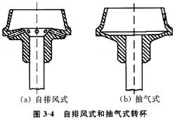根据转杯内负压的产生方式不同,纺纱器可分为自排风式和抽气式两种,如图3—4所示。自排风式纺纱器,转杯的底侧部开有若干排风孔,杯子高速回转时产生的离心效应使气体经这些排风孔排出,形成杯内负压。因杯盖与杯口封闭,气流流动由输送管道补入。为防止输送纤维在到达凝聚槽前直接冲向已被加捻的纱条上而形成过多的包缠纤维,在纤维出口处设置了隔离盘。抽气式纺纱器,转杯内的气体从杯口吸出,所以输送管道必须有一定长度伸人杯内并接近凝聚槽上的杯壁。