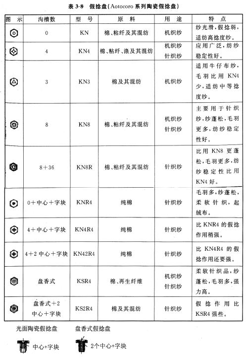 在纺纱线密度和工艺条件一定时,摩擦力矩主要与假捻盘的表面摩擦系数、纺纱张力及纱条在假捻盘上的包围角相关,即决定于假捻盘的结构参数和表面性状。因此,假捻盘的直径、表面曲率半径、表面性状是关键的技术参数。假捻盘现已系列化,可适应不同纤维原料和线密度的纺制。表3—8列举了系列假捻盘的主要技术参数和适纺原料及其应用和特点。