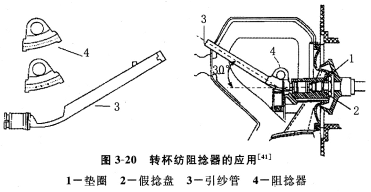 阻捻器(Torquestop)的诞生(如图3—20所示)改善了这一状况。阻捻器加装在引纱管处,纱条在杯内离开剥离点并经过假捻盘、引纱管和阻捻器。阻捻器内的纱线通道表面刻有若干沟槽或无槽,因此具有一定的摩擦系数。当纱条通过时,它起到了“阻捻”作用,使杯内纱段获得强捻,而输出纱条具有正常捻度,从而提高了剥离点处的纱条强度和纤维间的联系力,使纱条顺利剥离,减少断头。因此,加装阻捻器,可在设计捻系数较低时正常纺纱,纺出低捻转杯纱。这种低捻转杯纱具有质量优、条干好