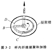 在须条从B点刚被剥离的位置,纤维数量应为零(空白区)。但实际上,转杯在不断回转,纤维不断向下输送和向下滑移,因此这一空白区会被新下滑的纤维覆盖。在纱尾D和“捻度传递长度”BC段堆积的纤维,称̶