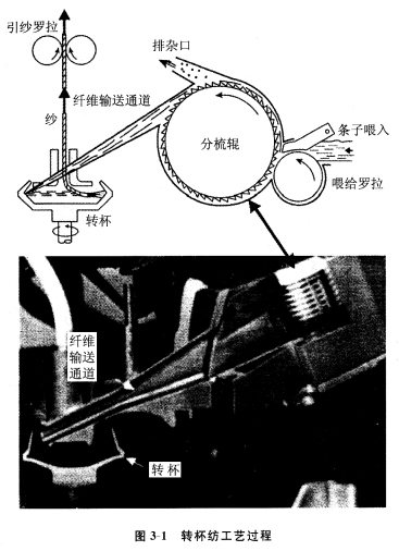 当接头纱从引纱管吸入杯内时,在离心力作用下被抛向凝聚槽与纤维环搭接,然后由引纱罗拉引出纱条。纱条随转杯回转而加捻,如图3—1、3—2所示。纤维不停地喂入、纱条不断被加捻成纱,再由引纱罗拉输出,从而实现了连续纺纱。