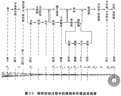 图3—3表示转杯纺纱工艺流程和纤维运动规律。从图3—3中可初略估算纺纱流程中的纤维运动规律。实际生产中可估算如下: