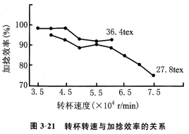 理论上,转杯纱的捻度应由转杯速度与引纱速度决定,与假捻盘没有关系。但实际上,转杯纱捻度及加捻效率与假捻盘有直接关系。追究其原因,是剥离点之后的捻度传递长度的影响。落人捻度传递长度上的部分纤维最终所获得的捻回比纱芯捻度少,造成捻度损失,降低了加捻效率。在实际生产中发现,转杯纺的加捻效率有时仅60%且与转杯速度有关。转杯速度越高,加捻效率越低,如图3R