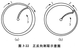 剥离点的运动速度大于转杯转速,为正向剥取,即正常纺纱状态,称“正向纺纱”,如图3—22(a)所示。图3—22(b)所示为反向剥取,即“反向纺纱”,剥离点的运动速度小于转杯的转速。