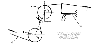 1、2-导辊3-传感器4-纱线a、b-应变片式传感器引线