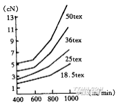 生产中,整经速度的提高可提高设备效率,但也会增加整经张力及整经张力不匀,从而增加整经断头,恶化整经质量,降低整经设备效率。图2-15表明,随整经速度提高,气圈顶