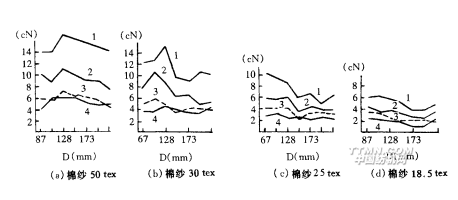 当导纱距离不同时,纱线退绕平均张力也发生变化。实践表明,存在着最小张力的导纱距离。大于或小于此值,都会使平均张力增加,这是因为导纱距离越长则退解气圈的纱线质量越大,退解时气圈离心惯性力也越大。导纱距离小时,则纱线在退解时易与筒子摩擦,又使张力有所增加。生产中一般采用的导纱距离为140~250mm,对于涤棉纱,为了减少纱条扭结,以采用偏短的导纱距离为宜。