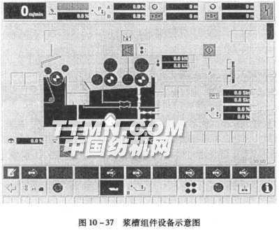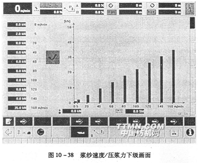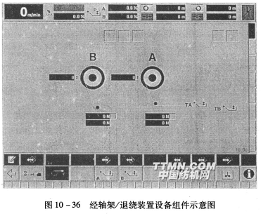(1)经轴架/退绕装置:图10—36所示的画面中,可调整对应浆槽A、浆槽B的经轴数,退绕张力设定值并监控实际值。