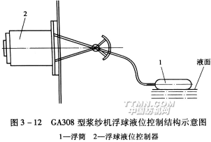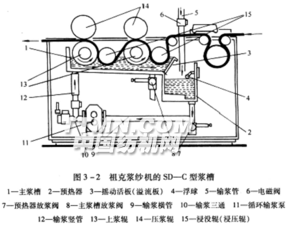 从图3—2看,由调浆桶送出的浆液经输浆管5和电磁阀6流入预热器,再从预热器下部经输浆横管9由循环输浆泵11抽吸,从输浆竖管12进入主浆槽1的前部。当浆液盛满时,即经后方溢流板上沿呈瀑布状流回到预热器2,完成浆液循环。主浆槽平底从前到后向下倾斜约35mm,也有助于浆液流泻和清洁。由于纱片经过浆槽上浆会带走一部分浆液,所以回流到预热器的浆液必定少于预热器送出的浆液量。这时安装在预热器中的浮球就会随着液面下降。浮球杠杆的支轴转动通过预热器外的电器盒,操纵限位开
