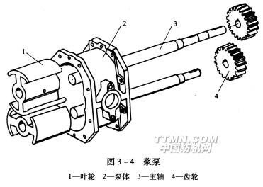 保持浆液循环的主要装置是循环输浆泵。祖克浆纱机配置的高效浆泵如图3—4所示,由一对特殊形状的叶轮组成,两片相位错开90°排列,用一对正齿轮传动。动力来自于专用电动机,1.1kw,转速1300r/min,配有减速器,使浆泵主轴速度能达到193r/min。循环浆泵能够确保输浆量较耗浆量高出30%以上。