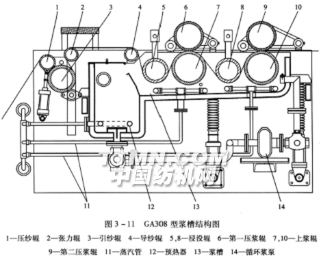 图3-lO为卡尔·迈耶·罗塔尔浆纱机的MPD型浆槽。在预热器底部装有网篮式大过滤网4,可以防止进入预热器的新浆或主浆槽回流的循环浆中的杂质、回丝流入输浆管,堵塞输浆泵以及造成浆污、浆斑。