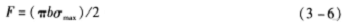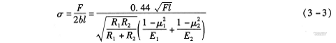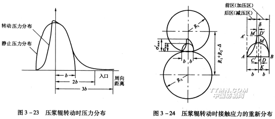 如图3—24所示,压浆辊静止时,压强(接触应力)总和可用以C点为中心的半椭圆面积AAMB表示,其半轴为b和σmax,σmax为最大压强,总面积等于压浆力: