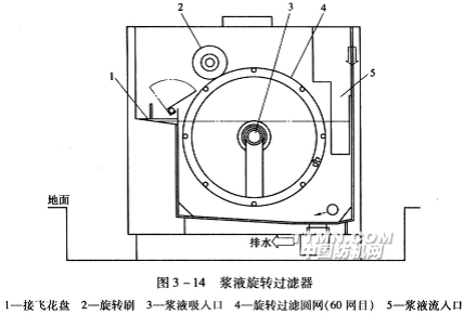 由于实际生产中循环浆液的飞花和浆渣出现较多,这里有必要介绍津田驹浆纱设备中采用的一种并不复杂的旋转过滤装置,如图3一14所示。
