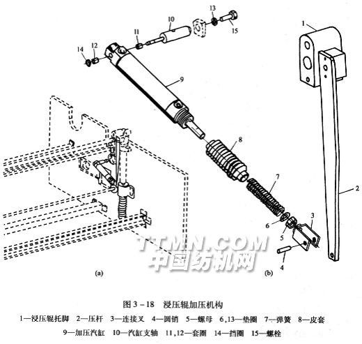 图3一18为祖克浆纱机浸压辊的加压机构,(a)为安装在浆槽墙板上的方位图,(b)为其结构。固定在浸压辊托脚l上的压杆2下部通过连接叉3、圆销4与加压汽缸9的活塞杆相连接。加压汽缸9的另一端则由汽缸支轴10连接在墙板上。当汽缸接受指令通入压缩空气时,活塞杆即拉动压杆2,使浸压辊托脚l向前摆动,使安装在托脚下方挂脚中的浸压辊对上浆辊进行侧向加压。此时受到螺母、垫圈加压的弹簧7的压缩,待汽缸不再通人压缩空气时,弹簧即恢复原有长度,推动压杆2,使浸压辊与上浆辊脱开。皮套8则起清洁保护作用。