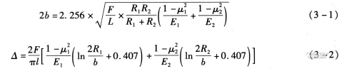 压浆辊与上浆辊成对组合,由上浆辊摩擦传动,如图3—21所示。按照弹性力学关于“半平面体在边界上受法向分布力”的分析,压浆辊O1与上浆辊O2受压浆力F作用时,由于弹性变形,两辊中心距将缩短△,接触部分由线接触变为面接触。接触面作用宽度为26,接触应力按椭圆分布。计算宽度26和压缩量△的公式为: