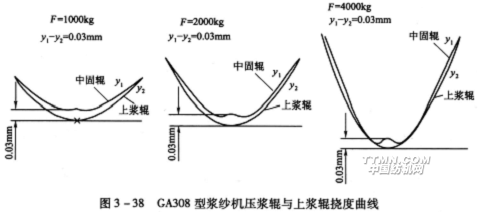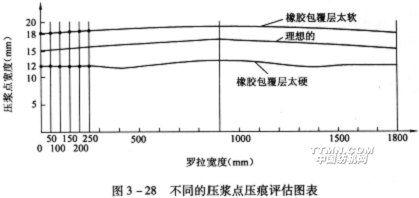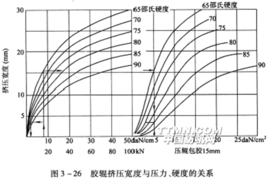 从上述分析中可知压浆力、压浆辊的硬度(至于上浆辊的硬度,因为是不锈钢或邵氏A型硬度95°以上的硬橡胶包覆,其变形相对较小,可不予考虑)和挤压宽度是三个关联的参数。图3—26提供的数据可作参考[15]。