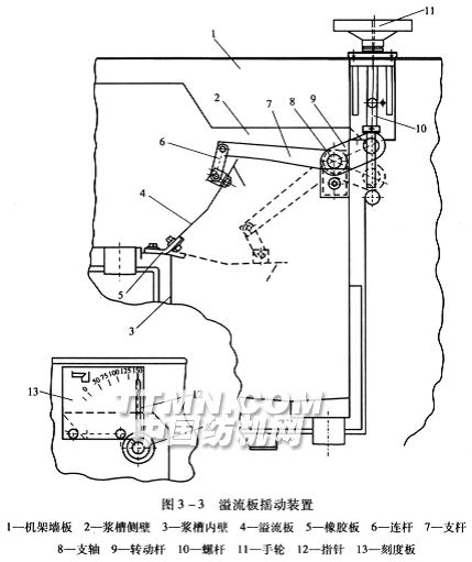 图3—2为祖克浆纱机SD—c型浆槽,其主体部分在前方,是执行上浆的部位。后方作为输入浆液,进行预热和浆液循环之用,故称为预热器或循环浆箱。但两部分实际连为一体,中间仅用摇动活板3隔开。摇动活板按其功能称为溢流板,其摇动装置如图3—3所示。溢流板4借橡胶板5作铰链,安装在主浆槽底板后沿。其上部连接着连杆6、支杆7、支轴8。支轴8上又装有转动杆9。当转动手轮ll时,螺杆10即令转动杆转动,通过支轴、支杆、连杆使溢流板4摇动。支轴上安装的指针12即在刻度板13上指示主浆槽浆液面的高度,最大值为150mm,相当于200mm幅宽浆纱机的浆槽最大容积为150L。